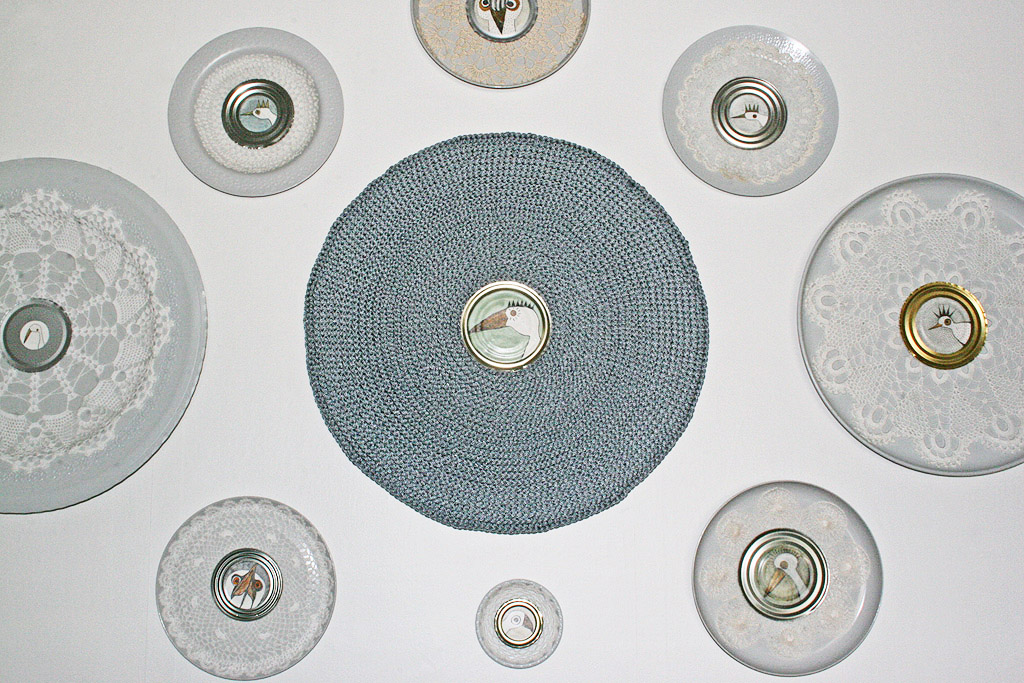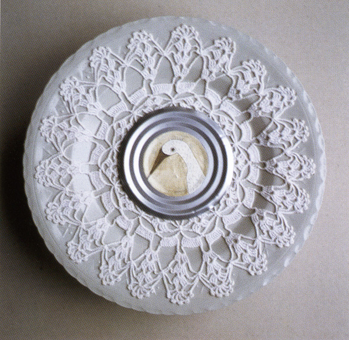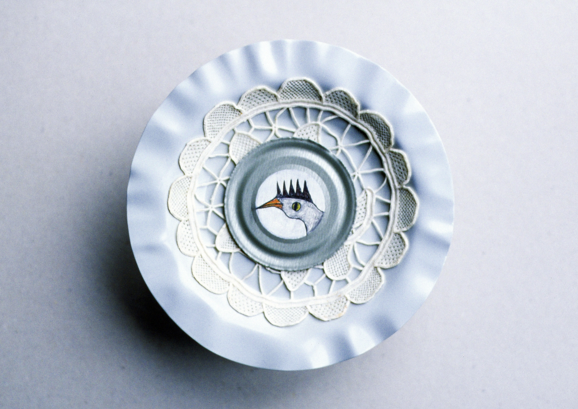 "Lydløs sang fra 100 hermetiserte blondefugler" - detalj // "Silent song of 100 preserved lace birds" - detail - 17x17 cm