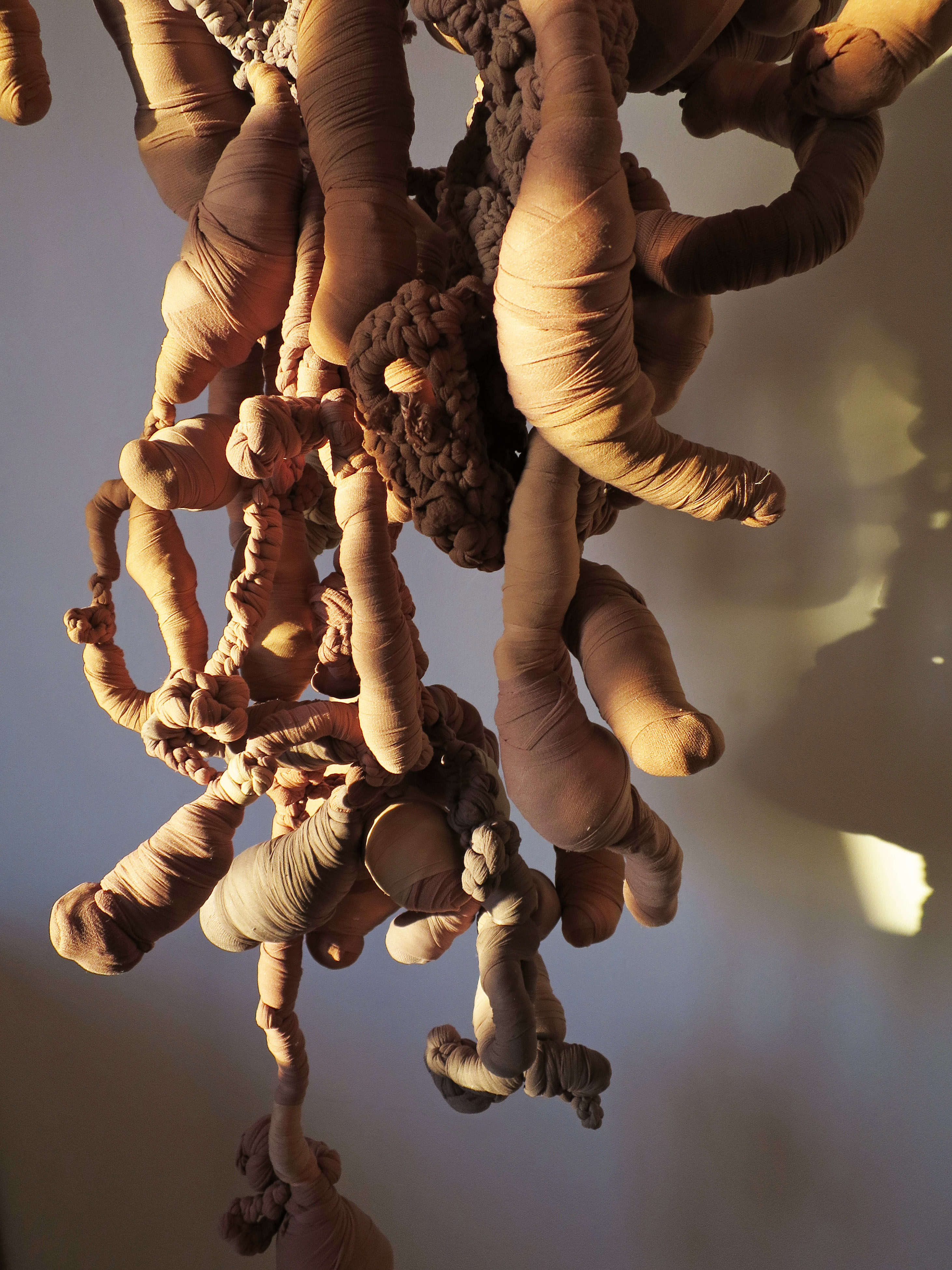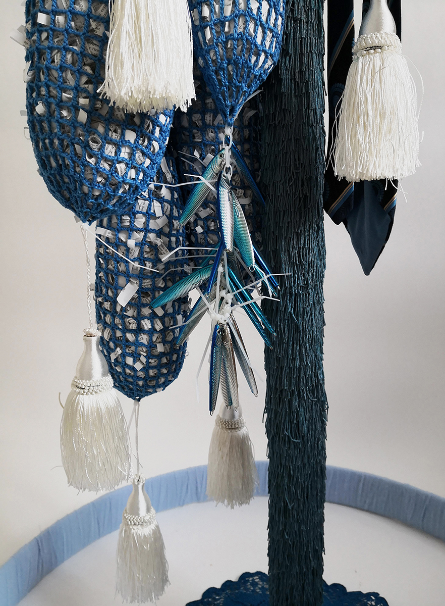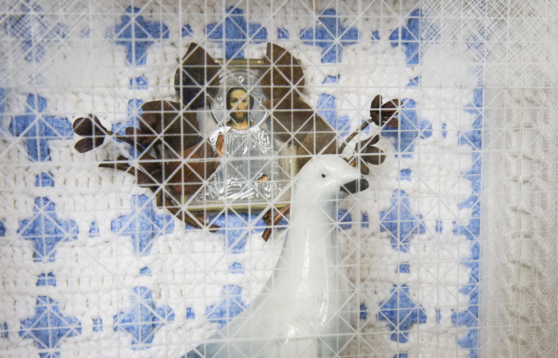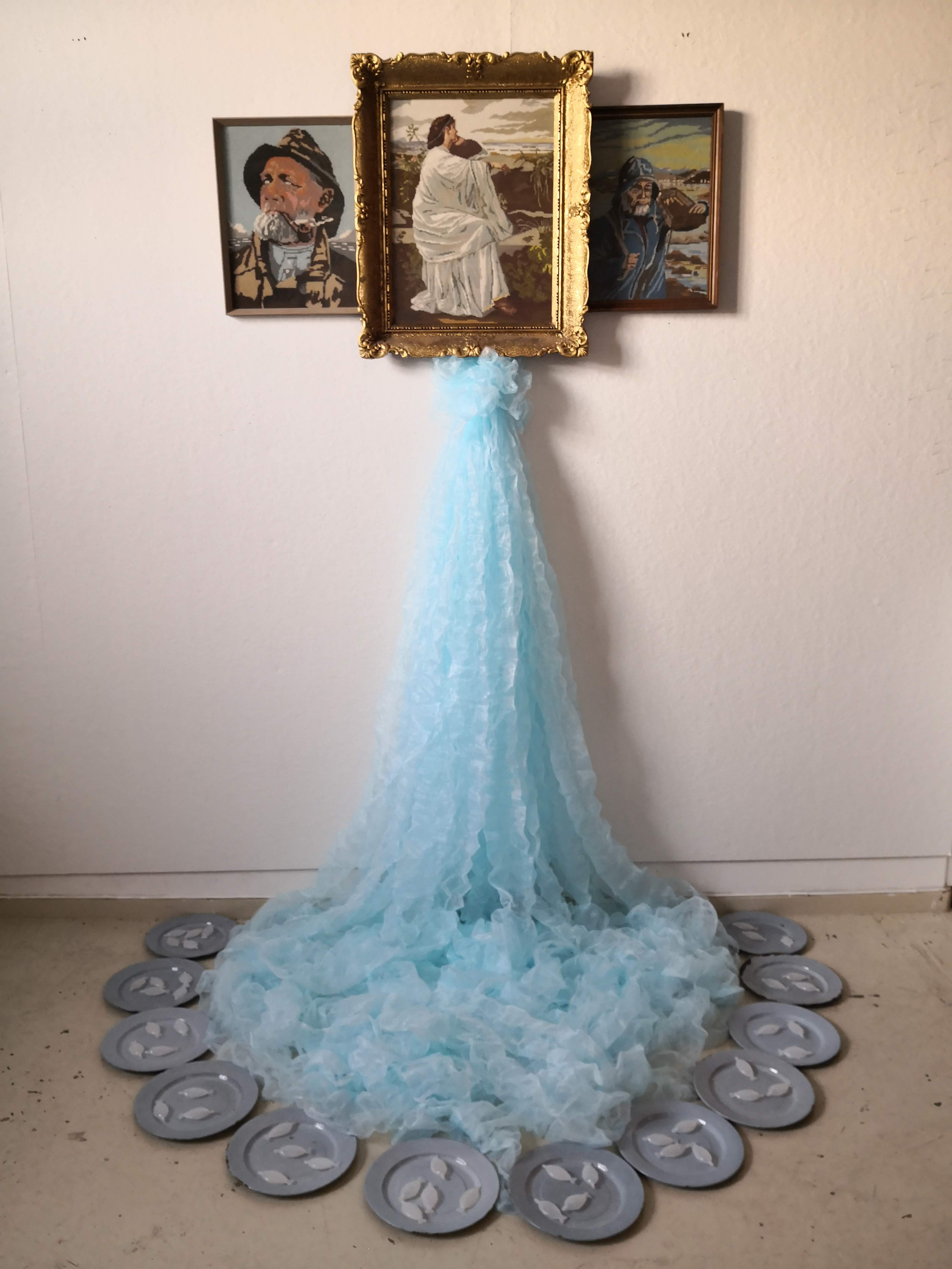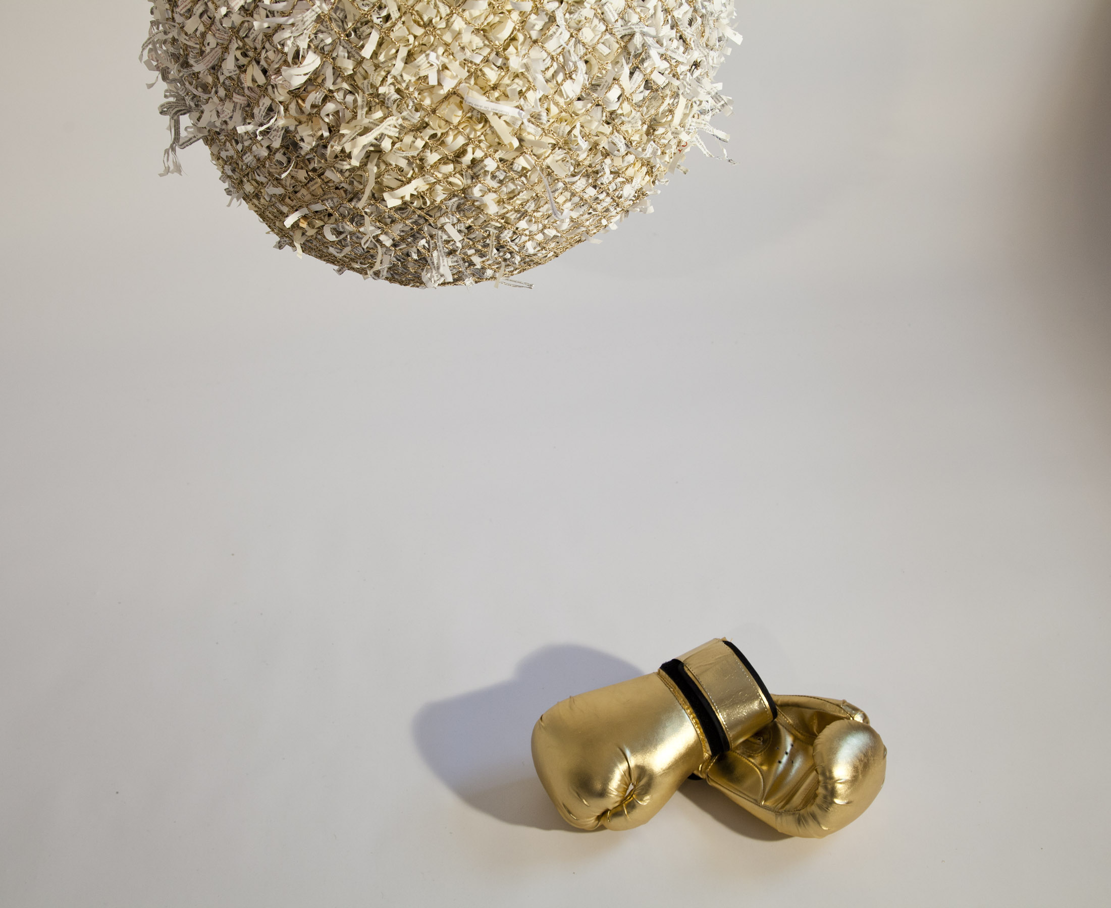 " Stillhet", heklet nett, boksehansker og makulerte bibelsider. Vises i Kunsthall Grenland