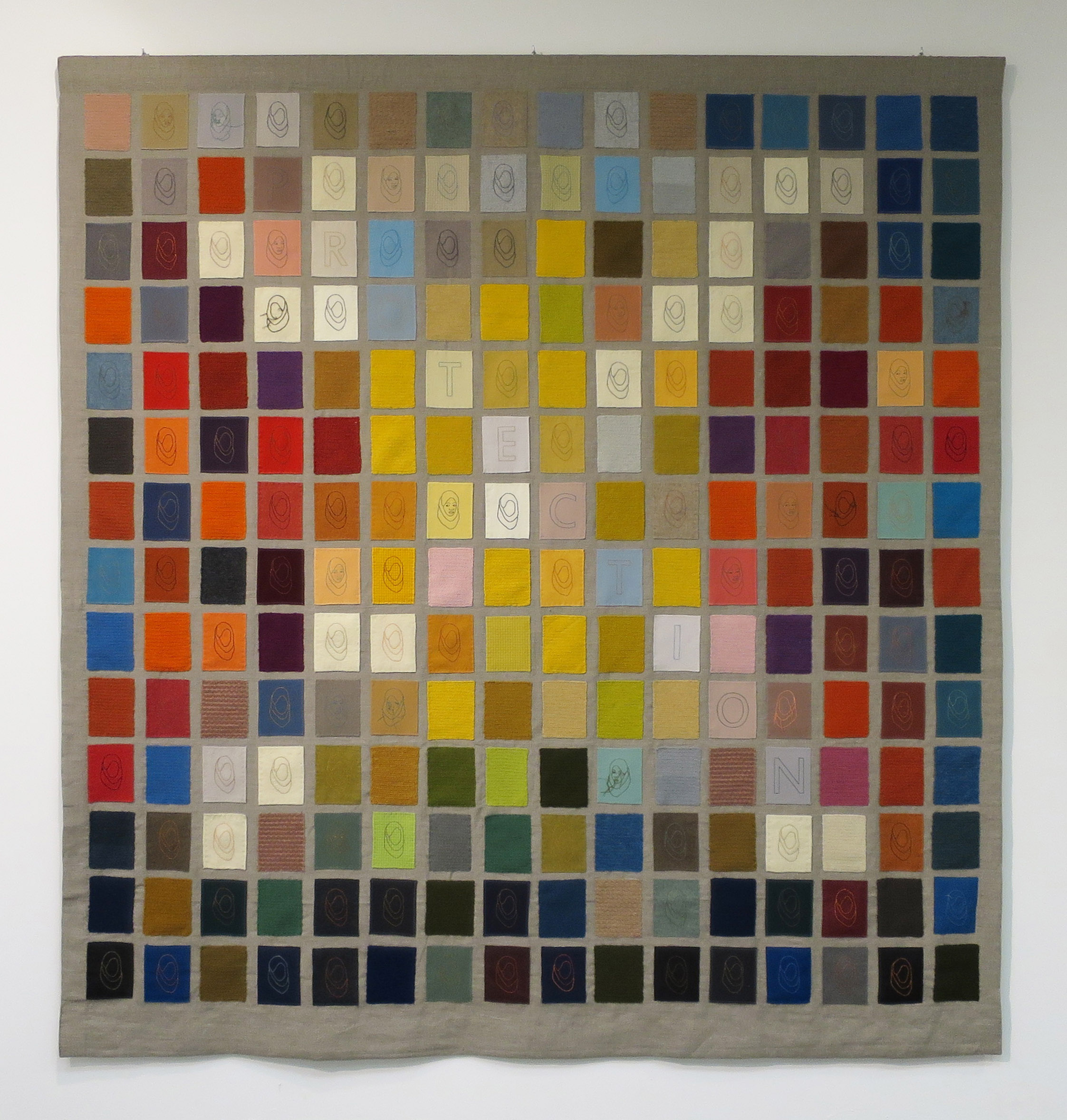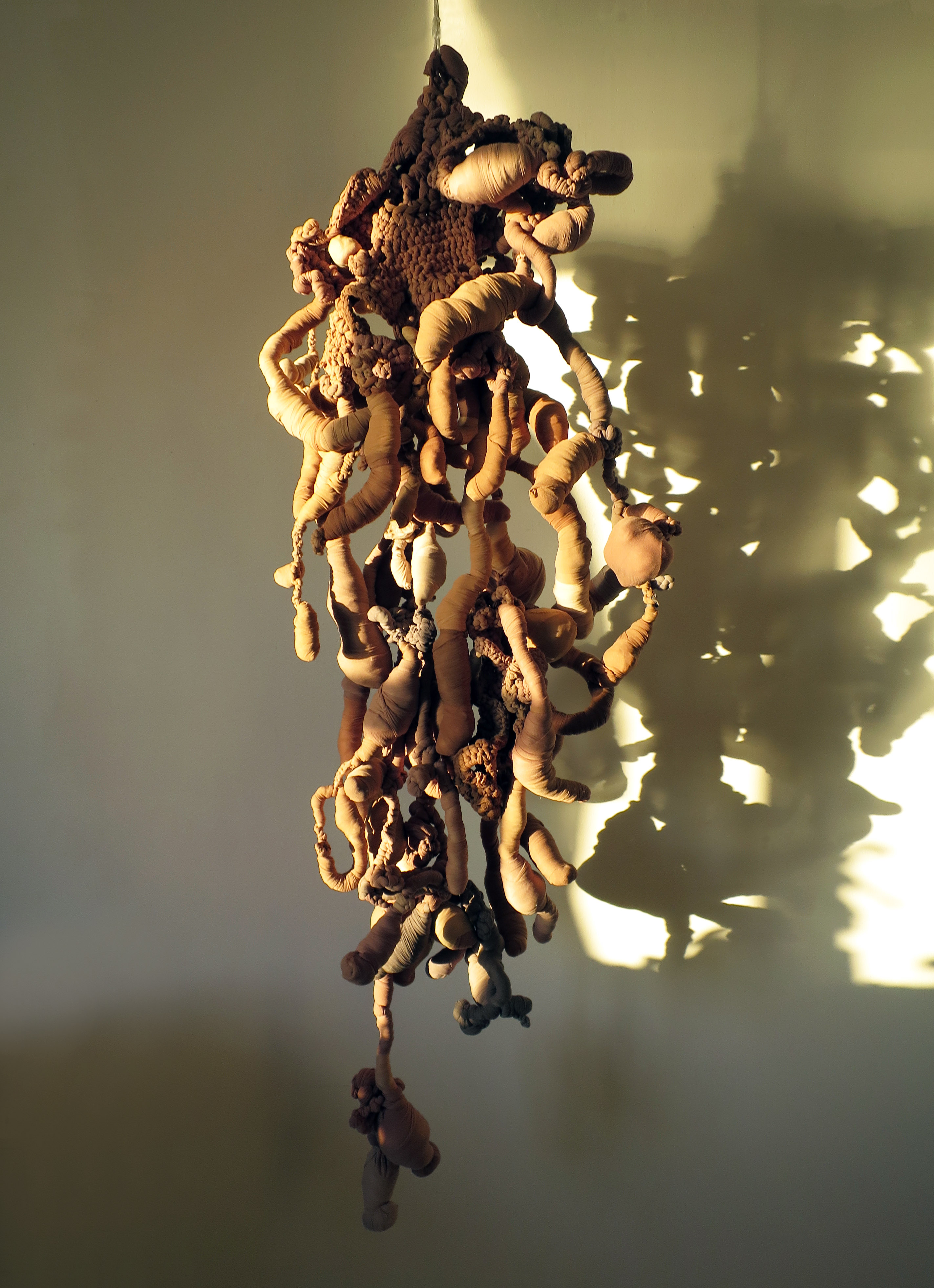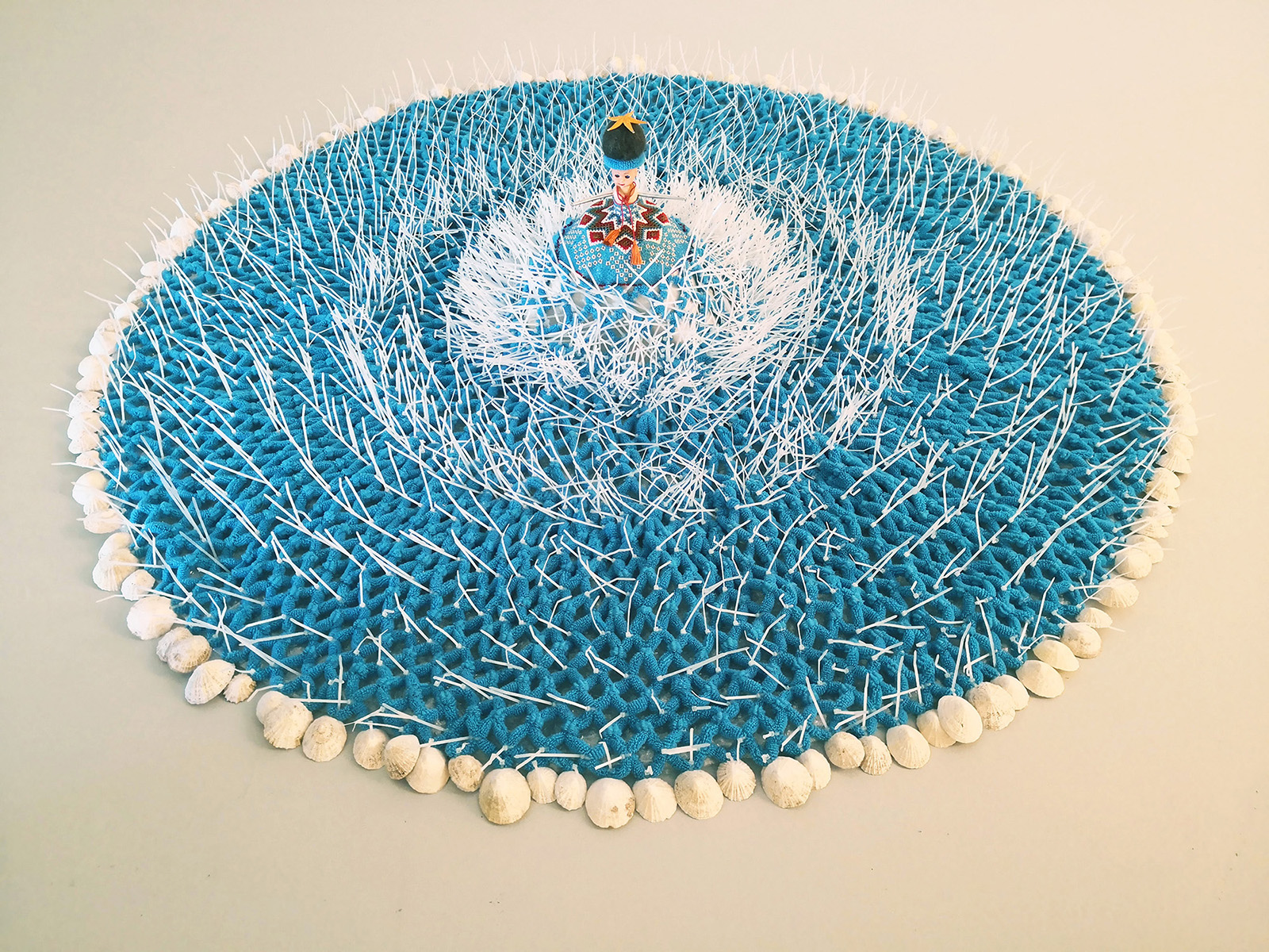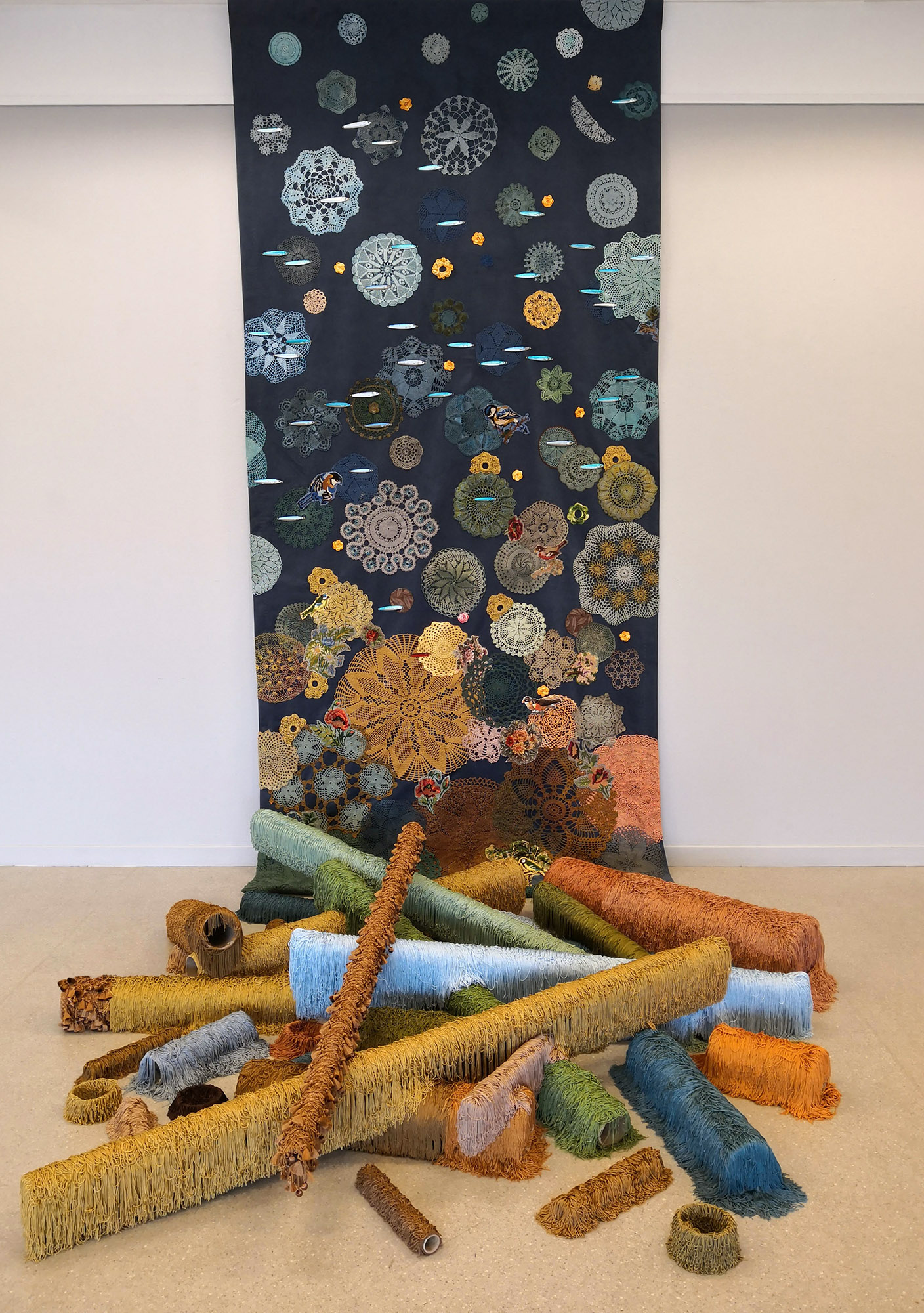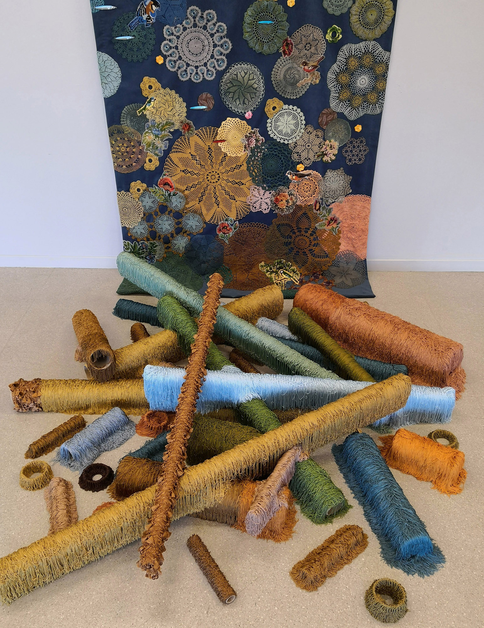 " Stillhet", heklet nett, boksehansker og makulerte bibelsider. Vises i Kunsthall Grenland