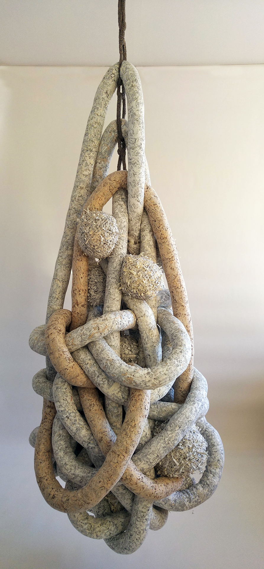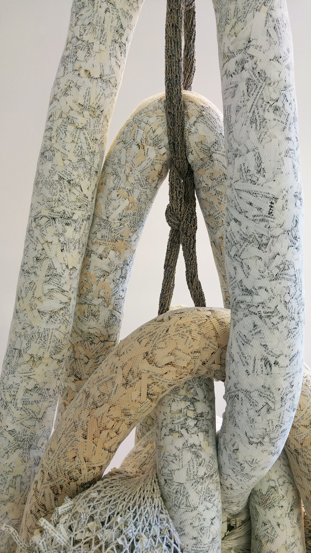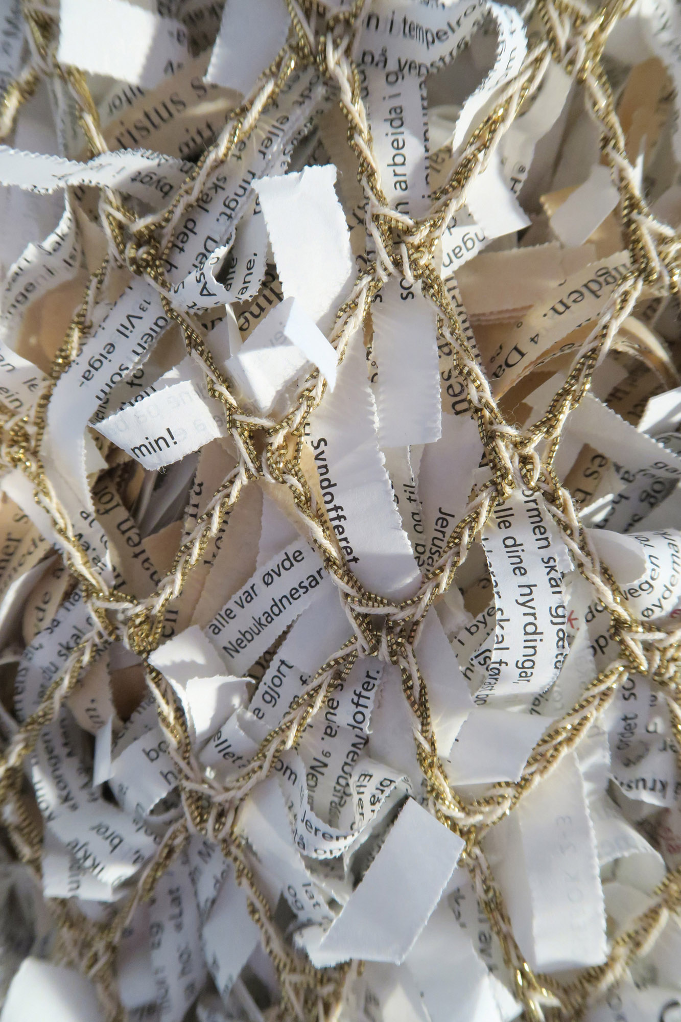 “Tyngde”, nettingpølse, nett, fylt med makulerte bibler