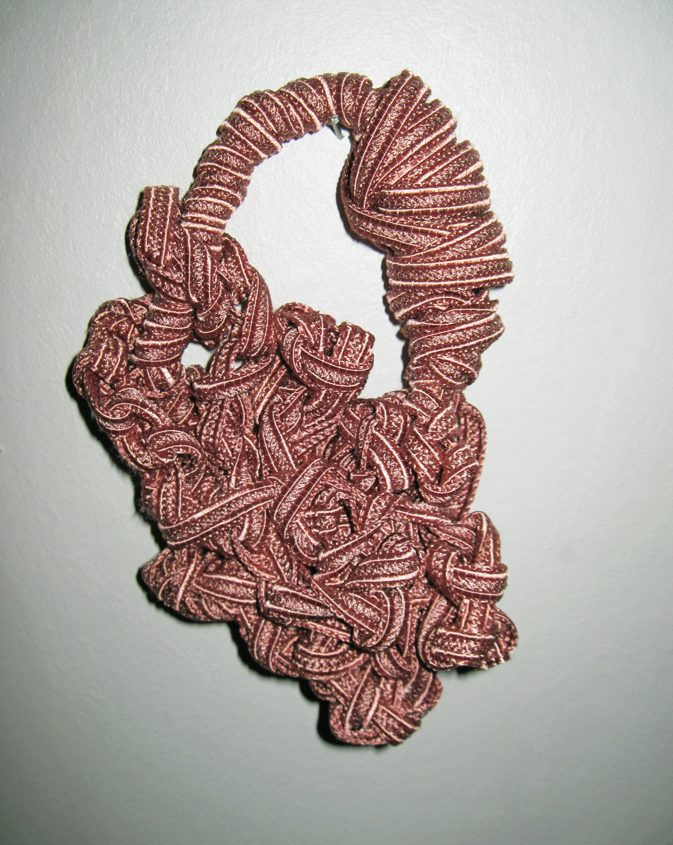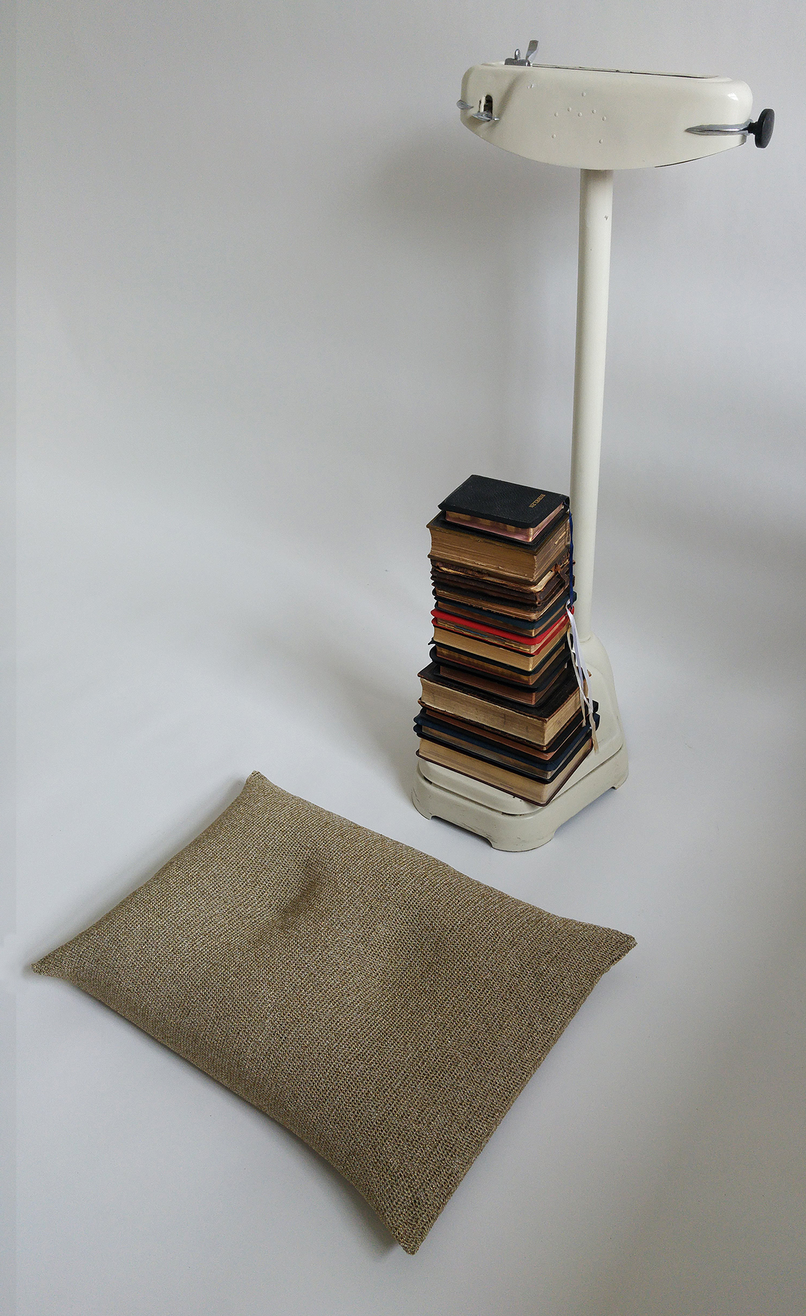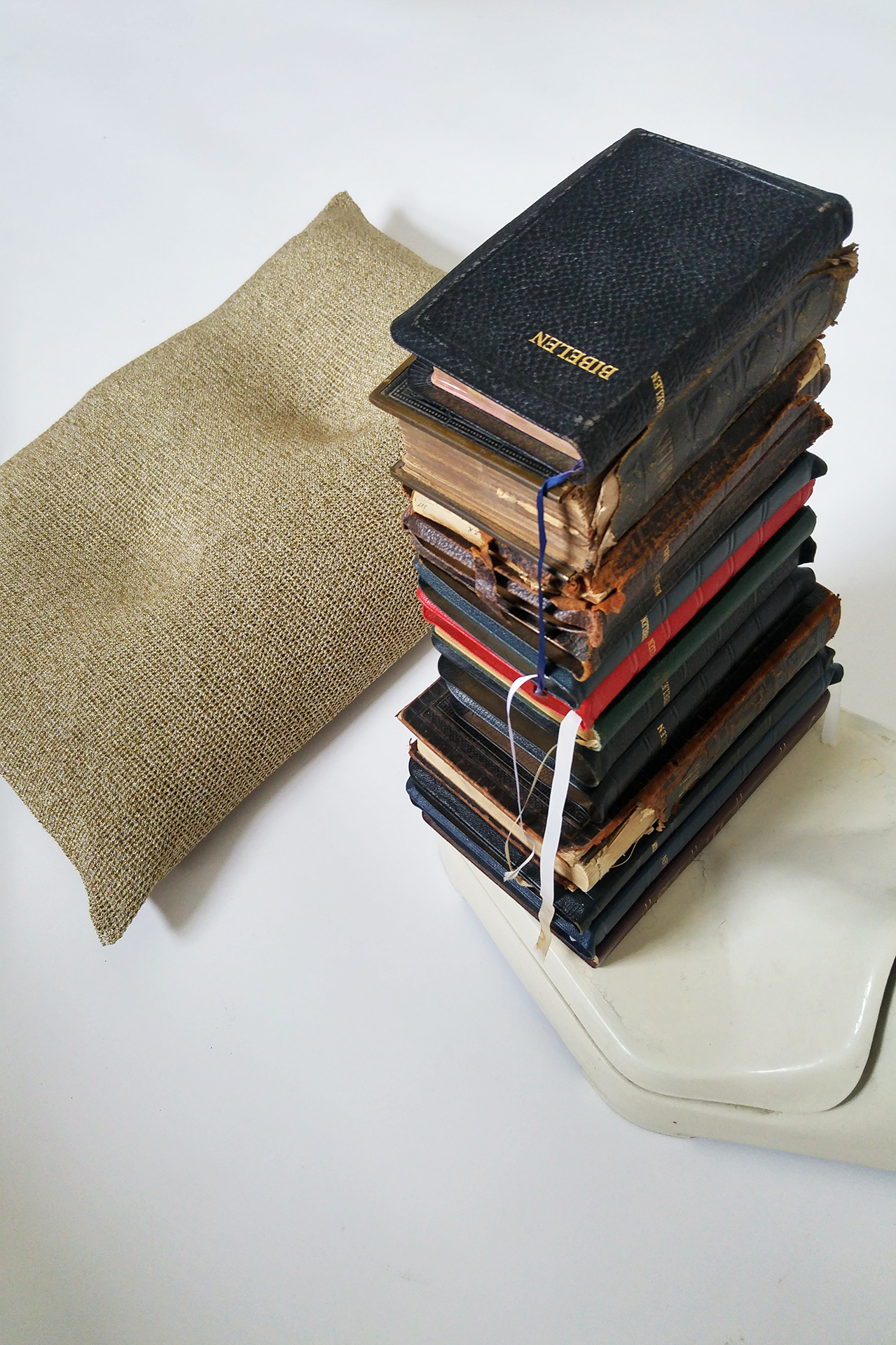 “Tyngde”, nettingpølse, nett, fylt med makulerte bibler