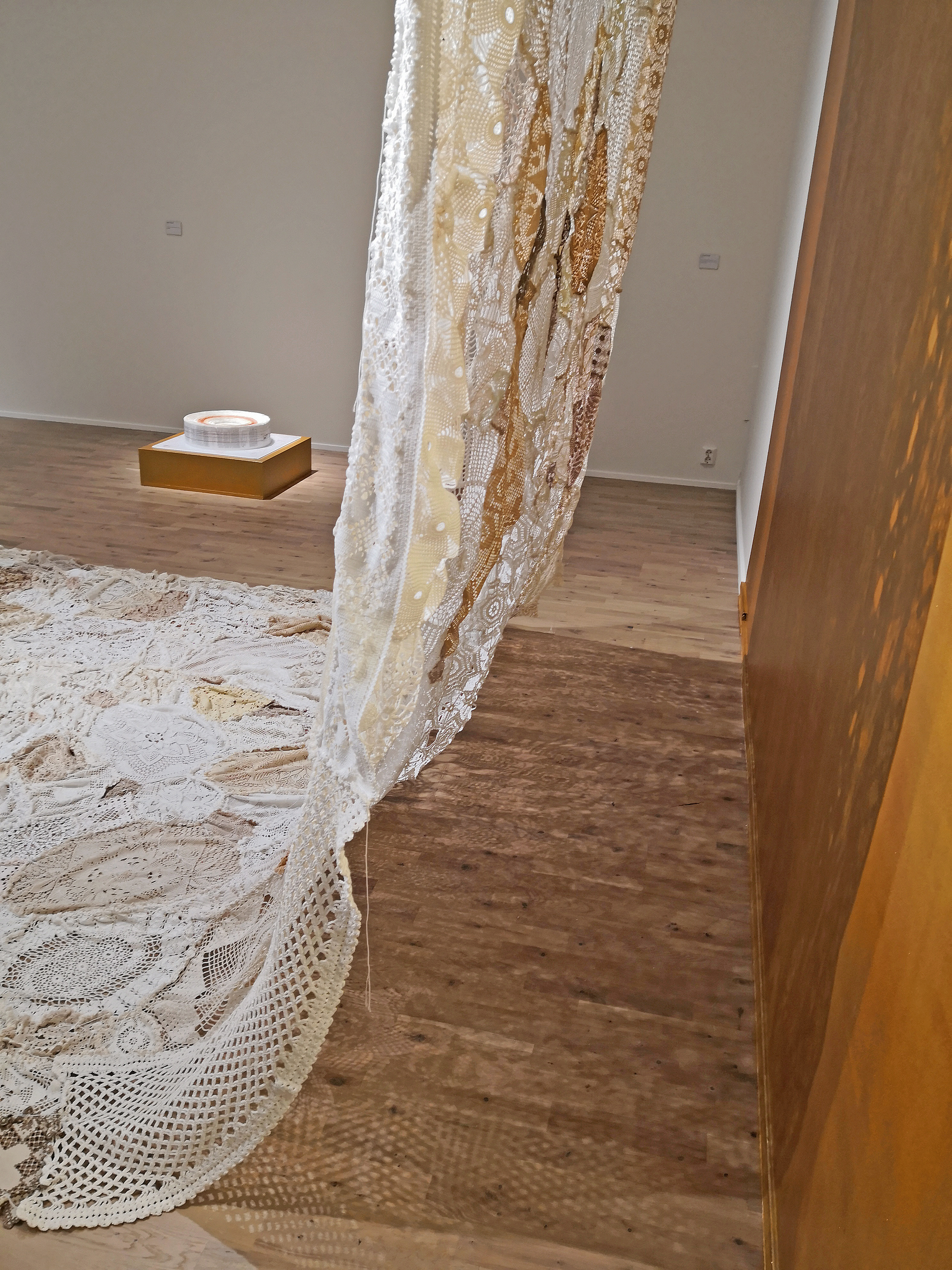 "Solskinnsbarn" liggende på sokkel, "Stillhet" hengende bak.