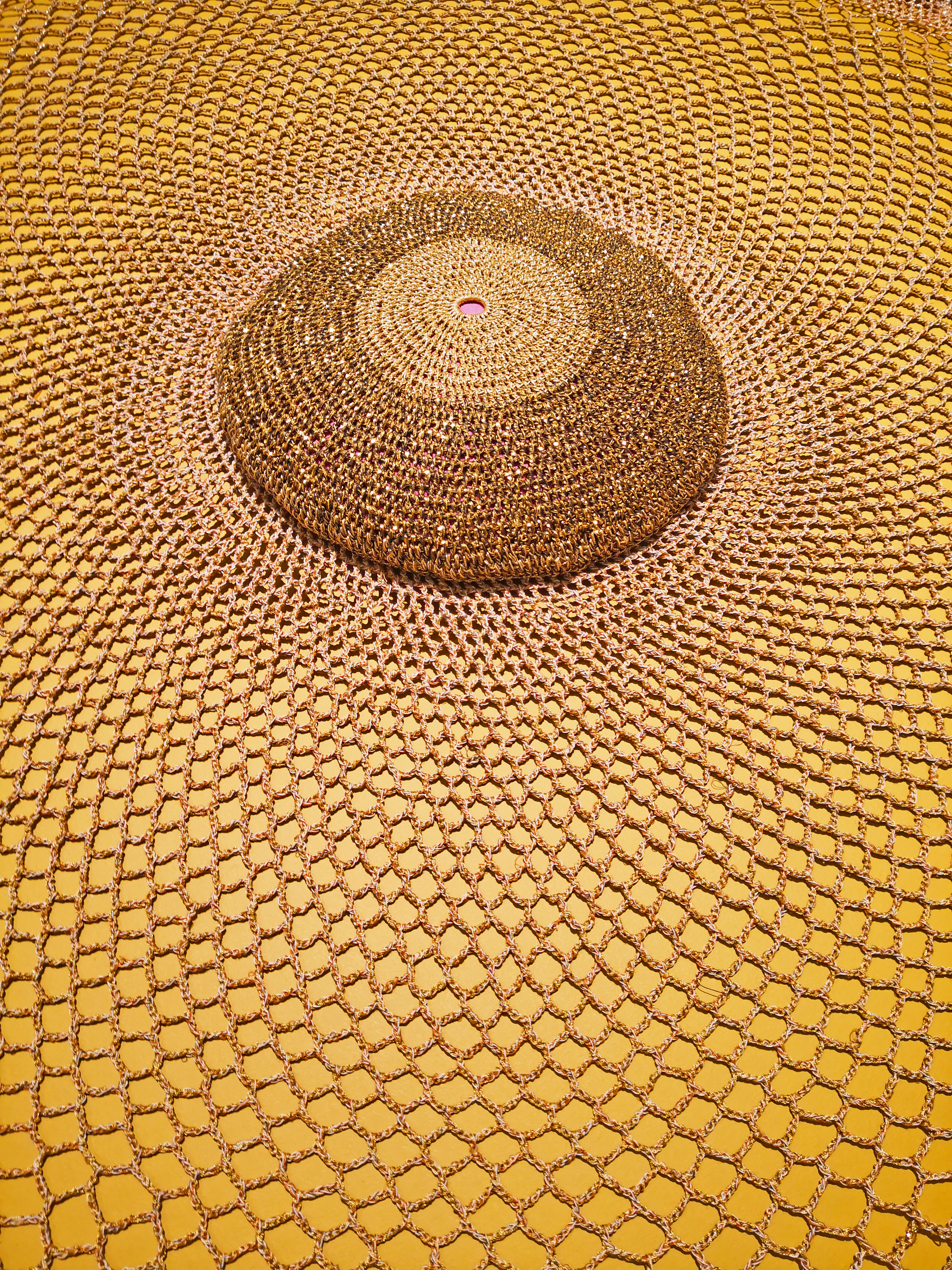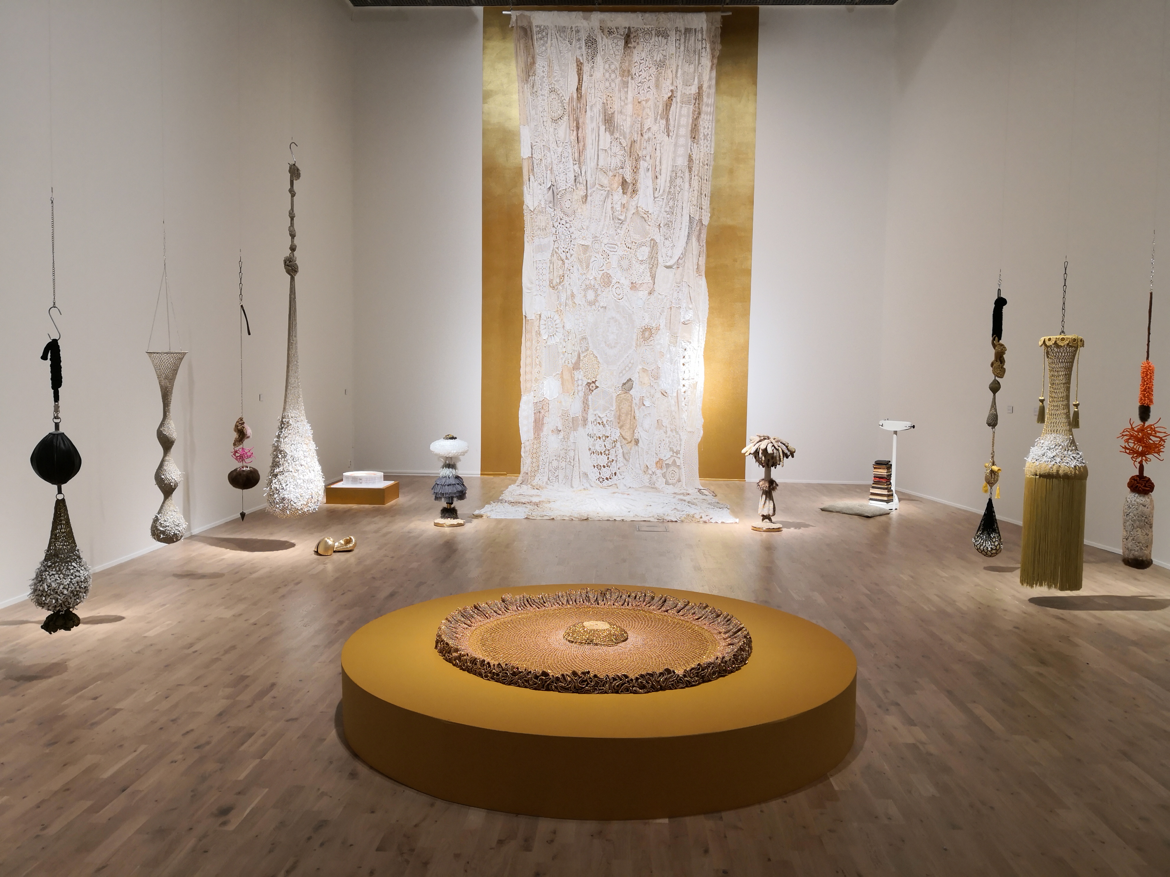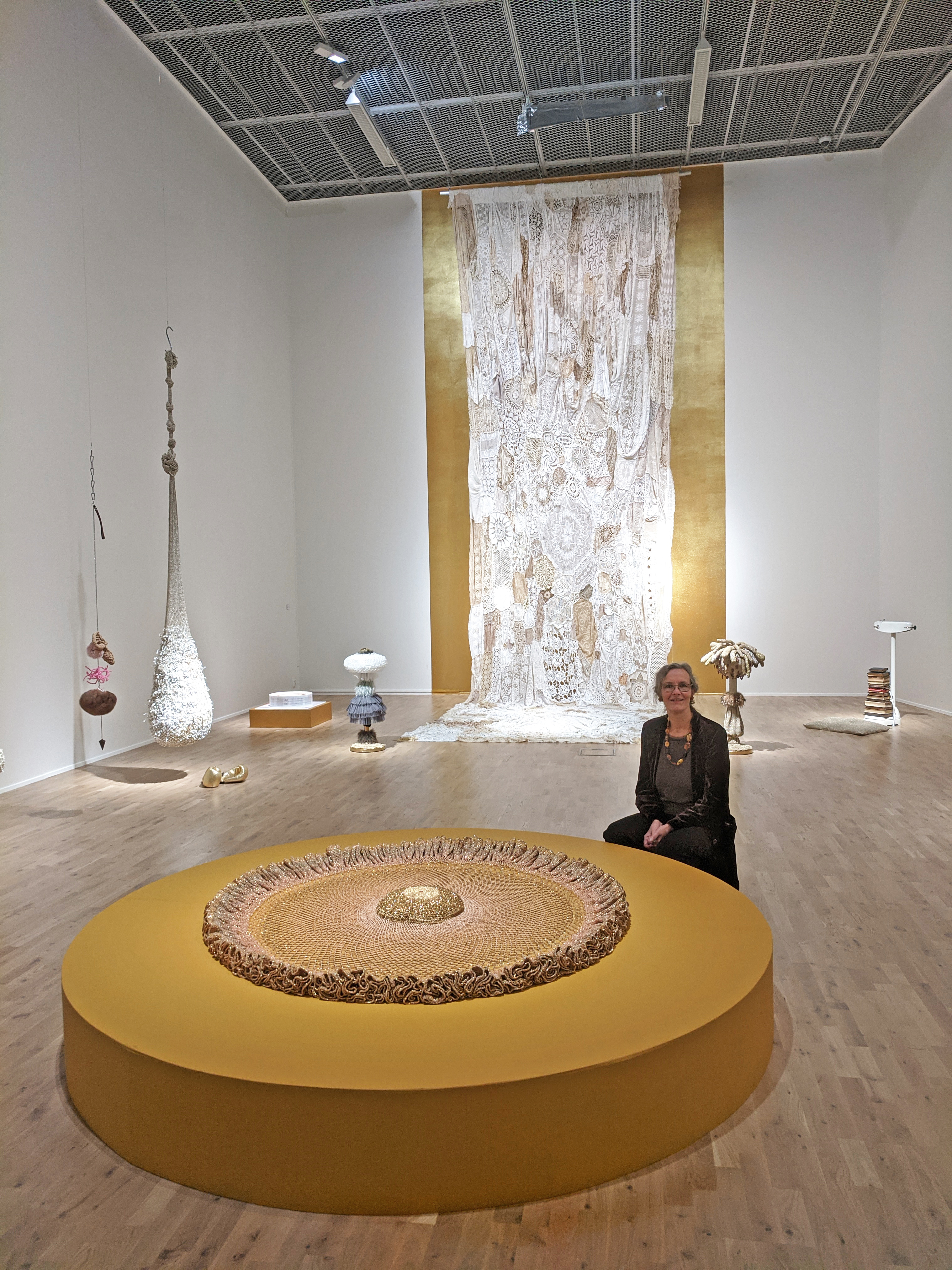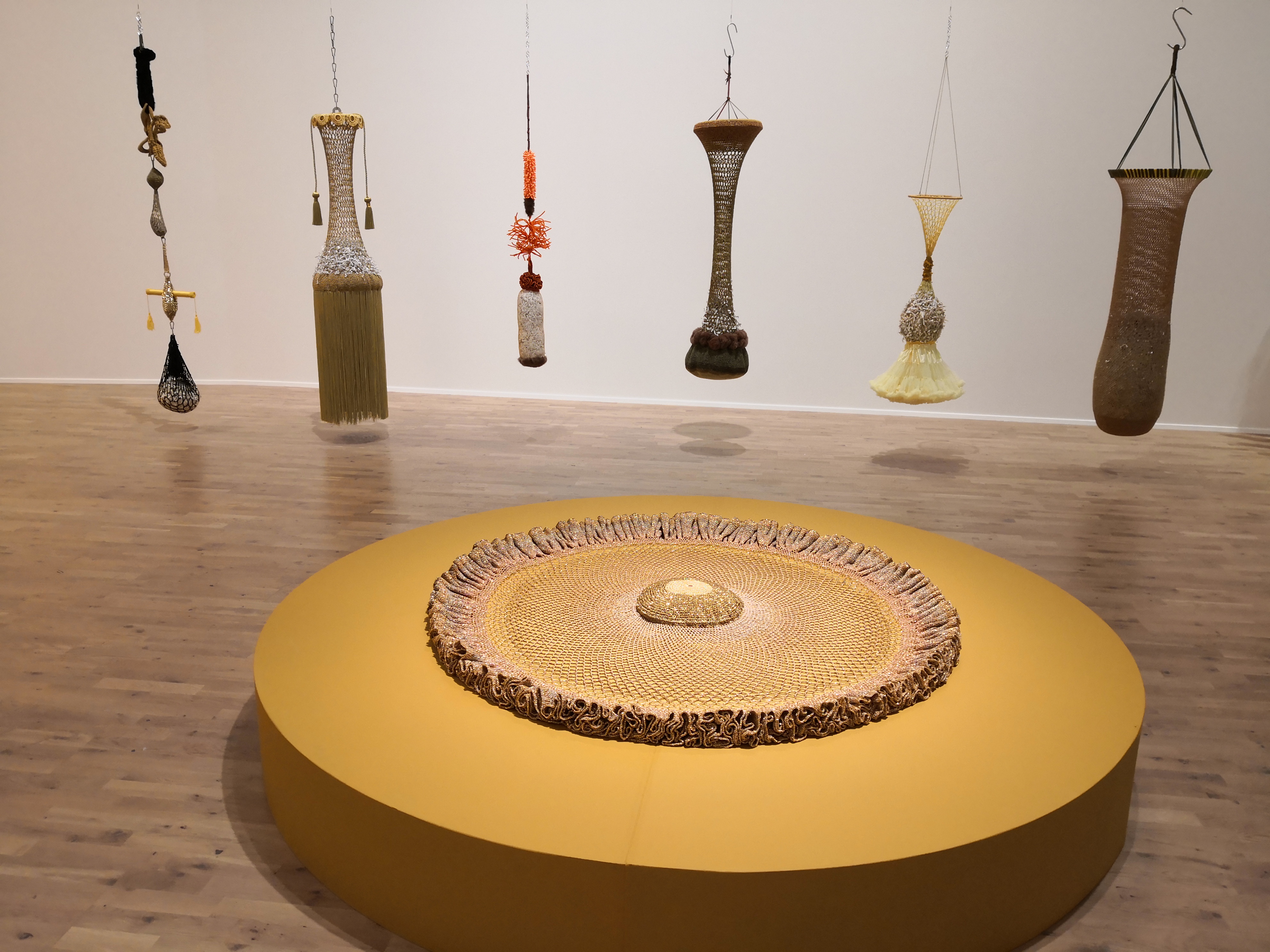 Foran på sokkel: "Solskinnsbarn", hengende fra taket :"Perleporten", hengende på vegg:"Utenfor"